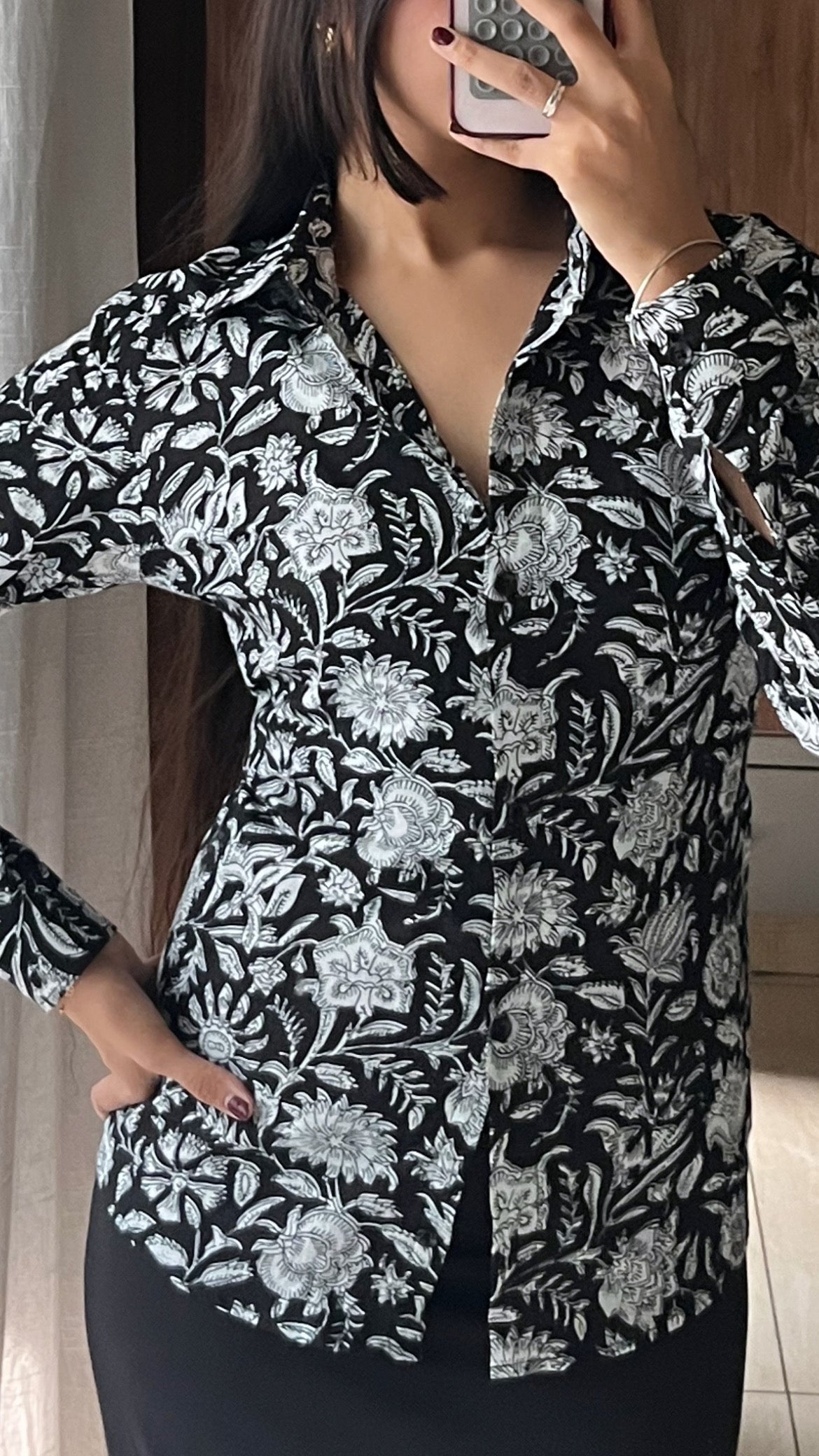 The Black current corset Shirt is your answer to classic meets cool — made in breathable cotton and handblock printed by artisans, it features a corset-style back you can cinch in for a snatched fit, or wear relaxed and straight.