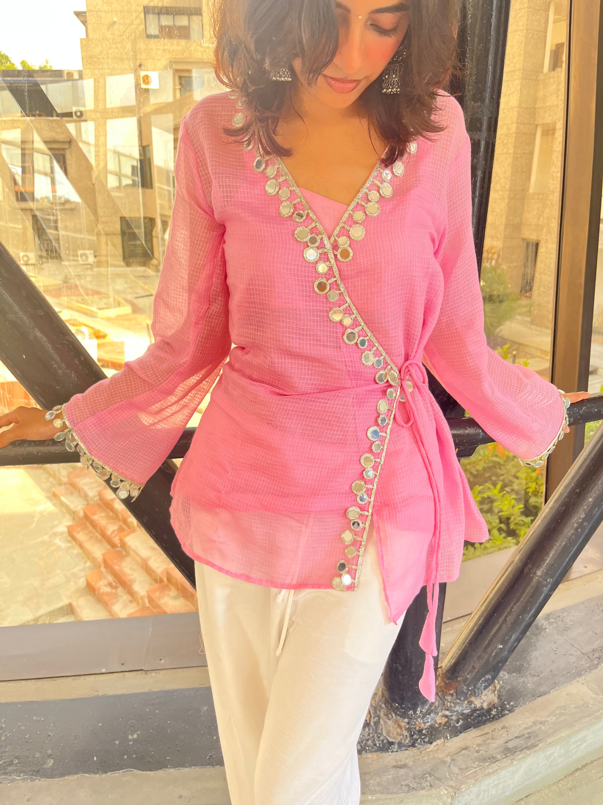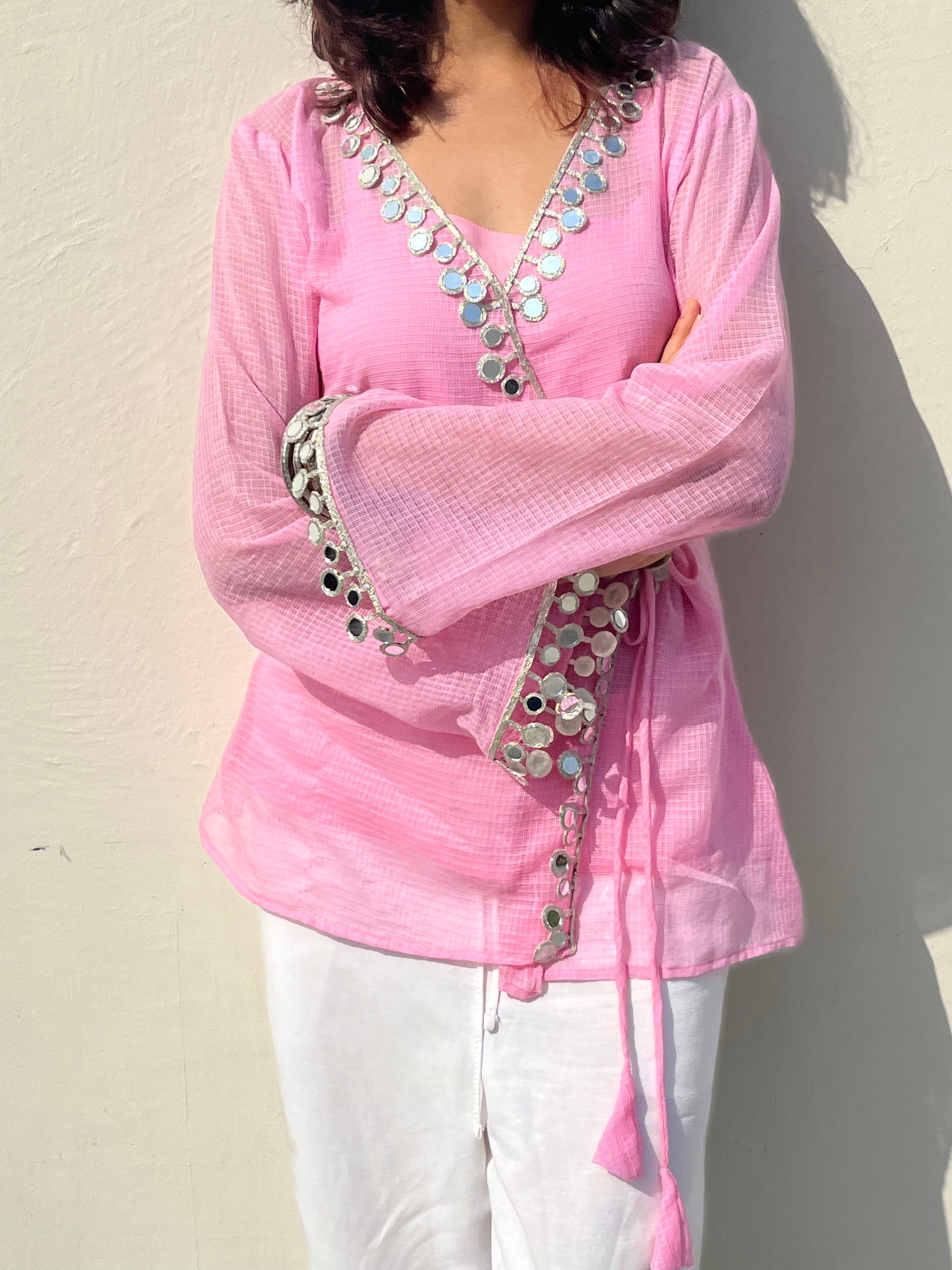 Description – A blush-pink beauty that feels like your first crush on campus 💕 Our Kota Doria Angrakha, sprinkled with mirror work, makes her flirty, festive, and oh-so-baddie. She’s the one you’ll wear from chai pe charcha to fest season.
