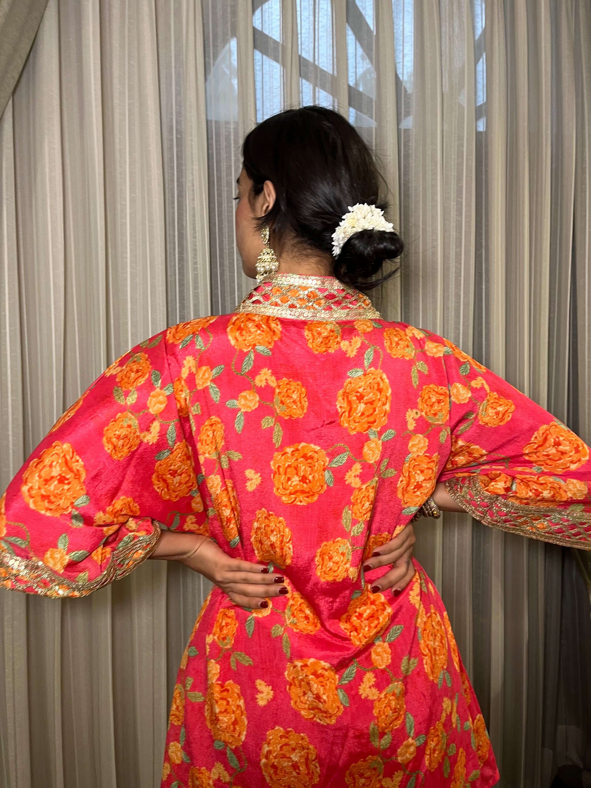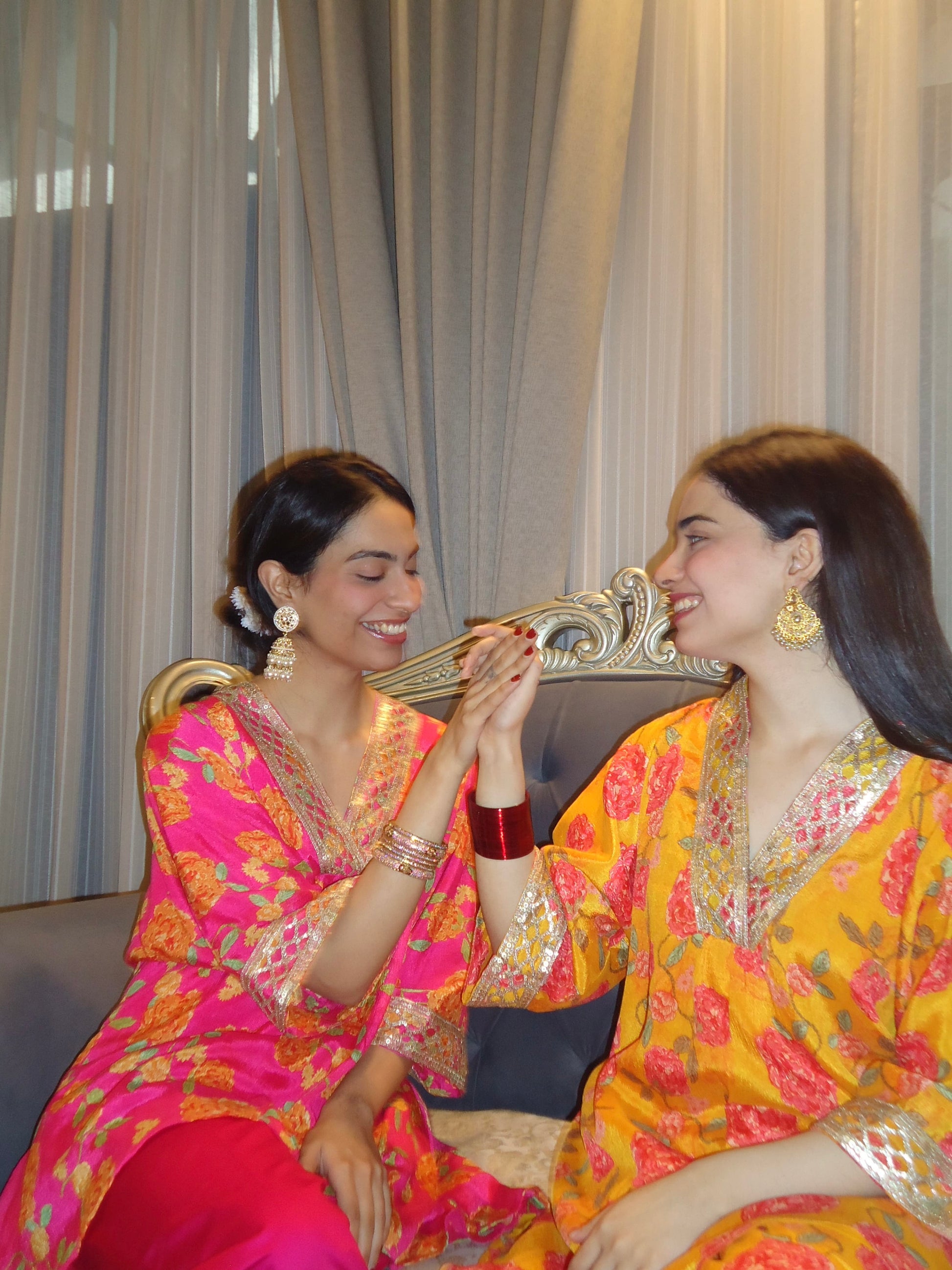 A festive dream in Rani pink — The Gulabi Genda Set comes printed in our signature genda phool motifs, paired with silk & cotton blend pants for that perfect festive balance. The V-neckline and 3/4th bell sleeves are detailed with delicate golden gota lace that catches the light just right. Made for the ones who love a little desi glam, without losing their comfort.