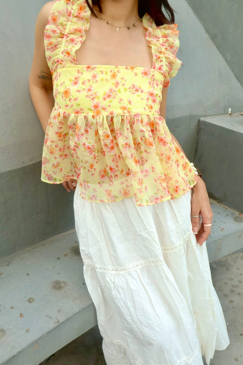 Description: Pastel yellow floral peplum top features playful ruffled straps and a breezy silhouette, perfect for a fresh, feminine look.