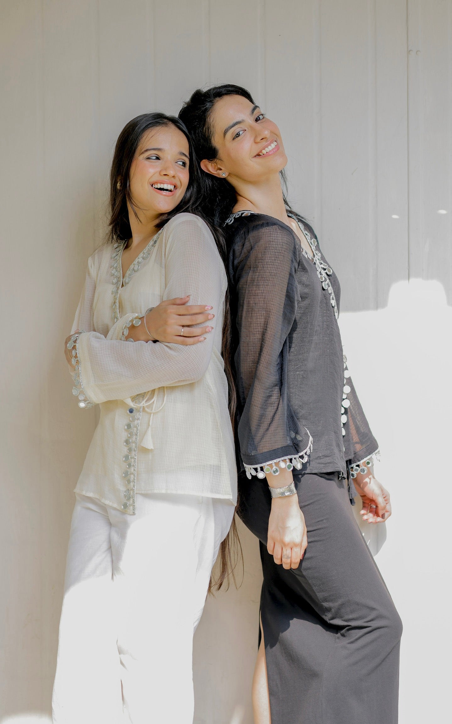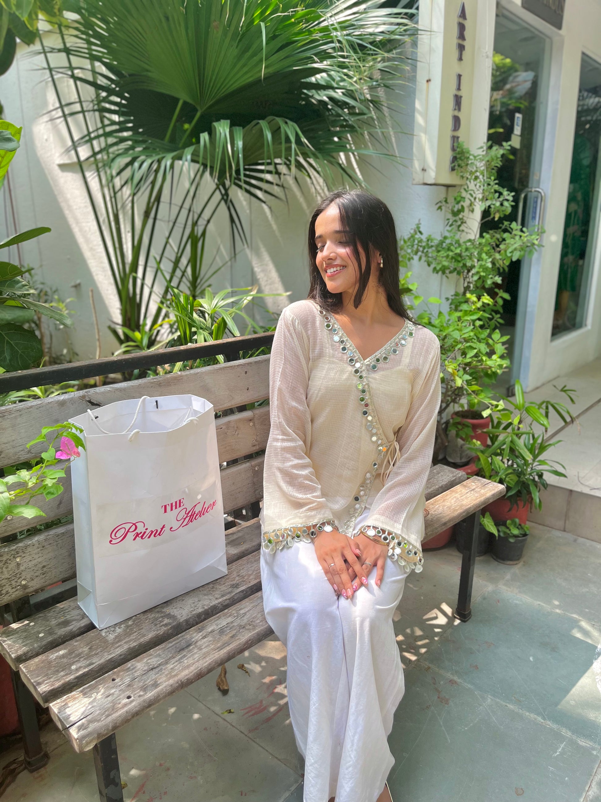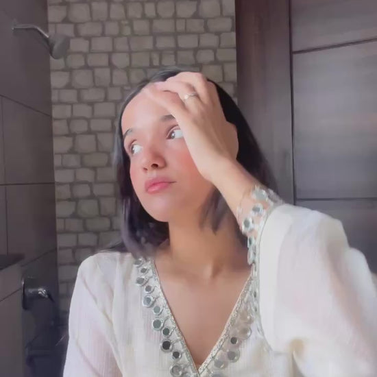 Crafted in weightless Kota Doria and detailed with reflective mirror work, this ivory beauty is made to glow under the sun. Understated yet festive, Noor is all about letting your vibe do the talking.