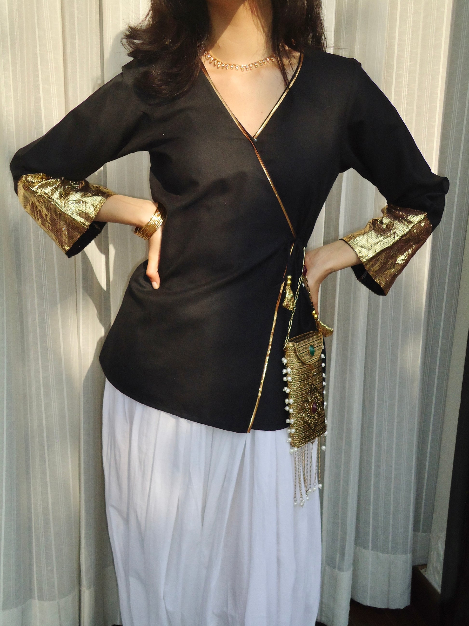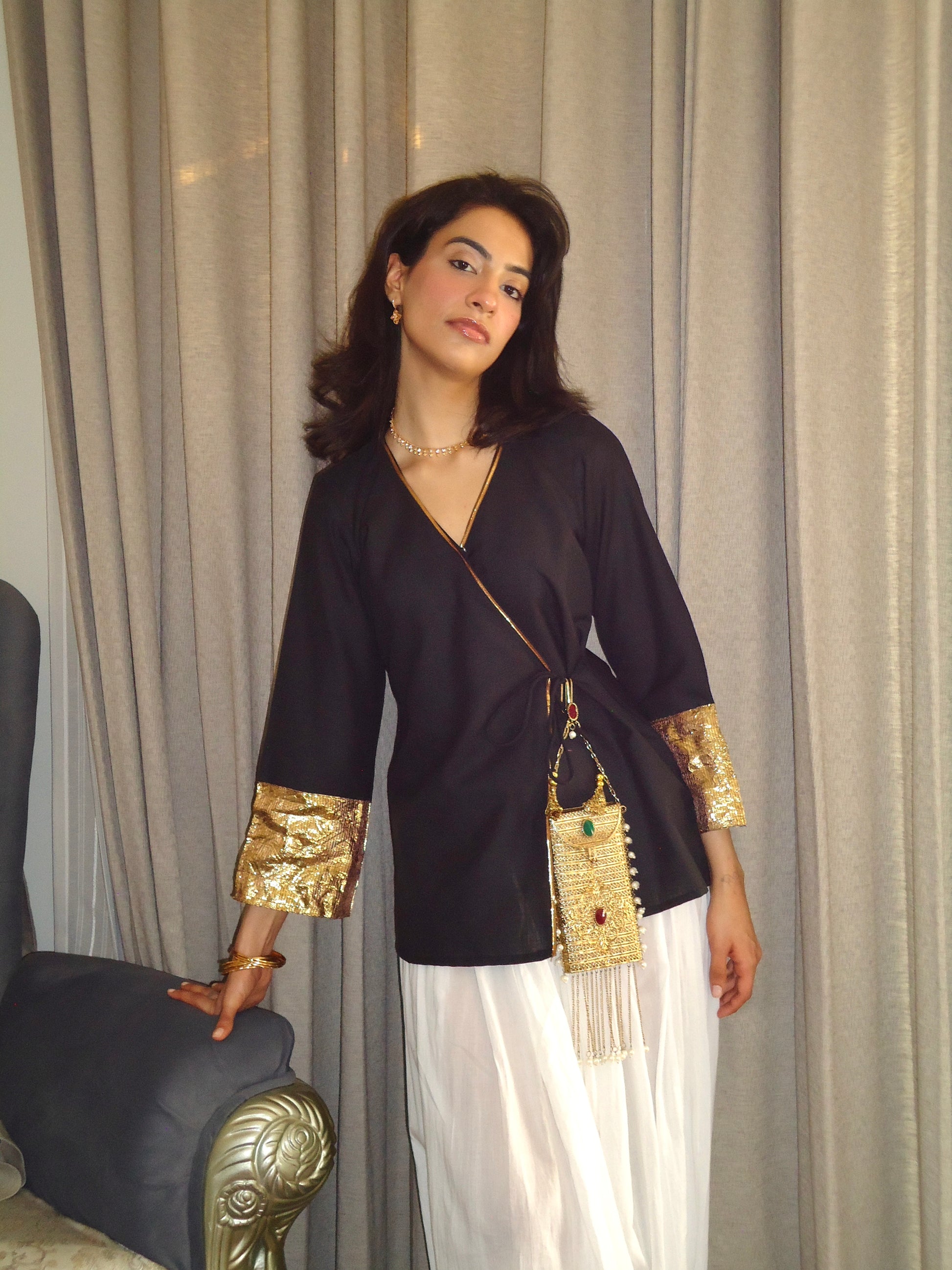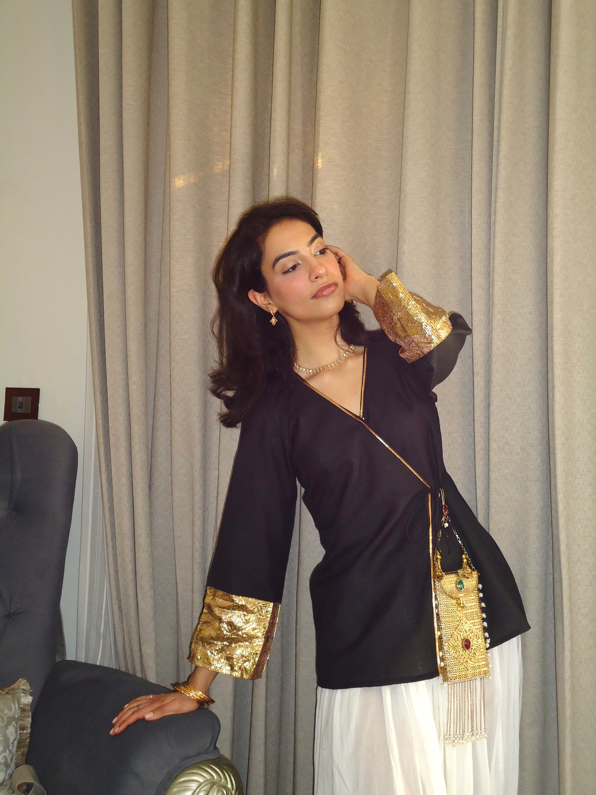 A bold black angrakha in our textured Loomed Linen Cotton — breathable, structured, and effortlessly striking. Accented with refined gota piping tracing the neckline and wrap detail, finished with pure gota sleeves and classic tassel tie-ups. She’s drama without trying too hard.
