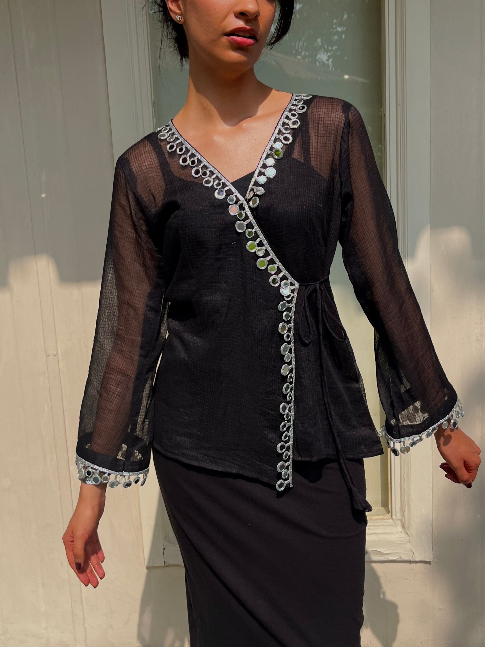 Description- A fresh take on our most-loved Kota Doria Angrakha, now updated with mirror work to make her festival-ready. She’s breezy, she’s baddie, and she knows she’s the one you’ll be reaching for this season.